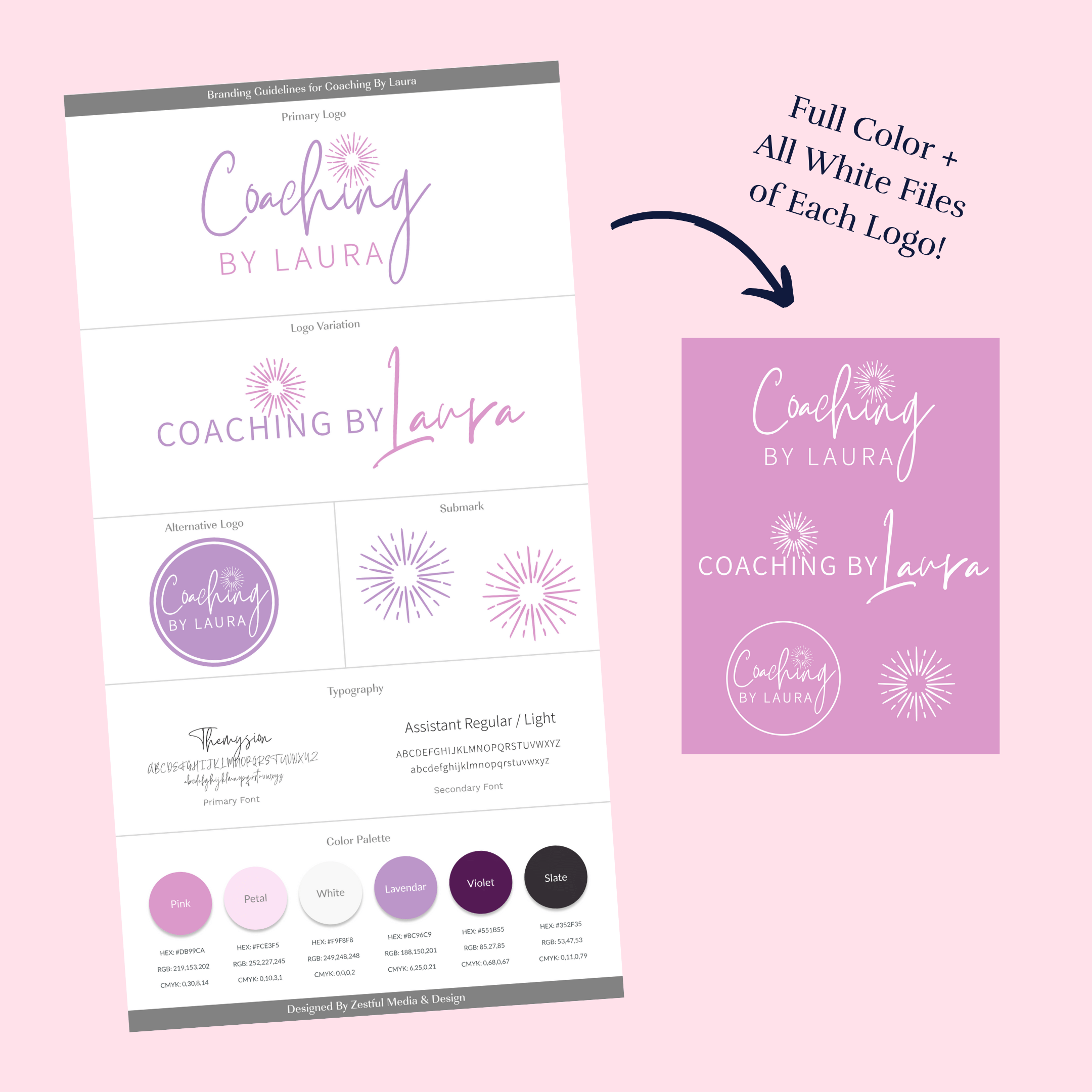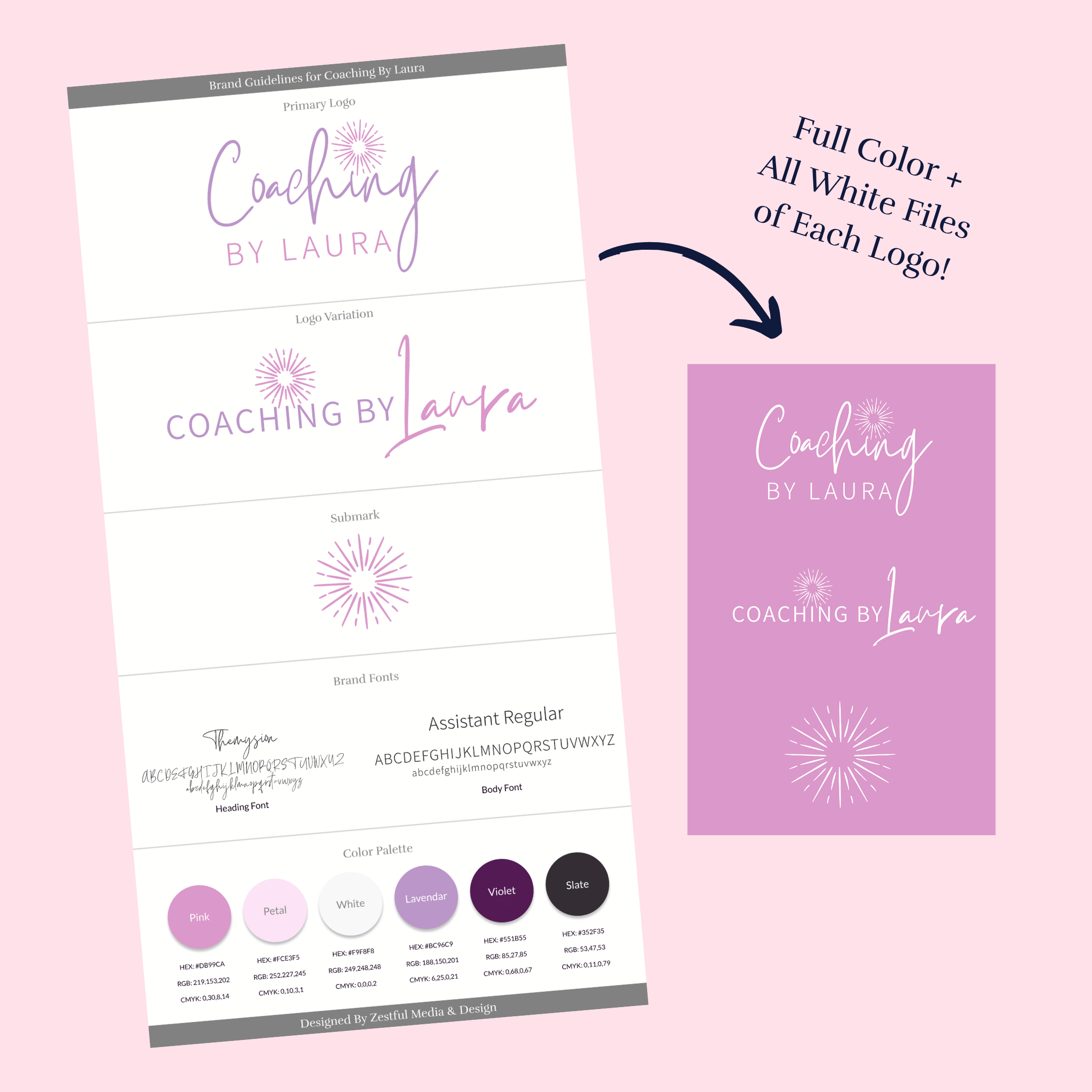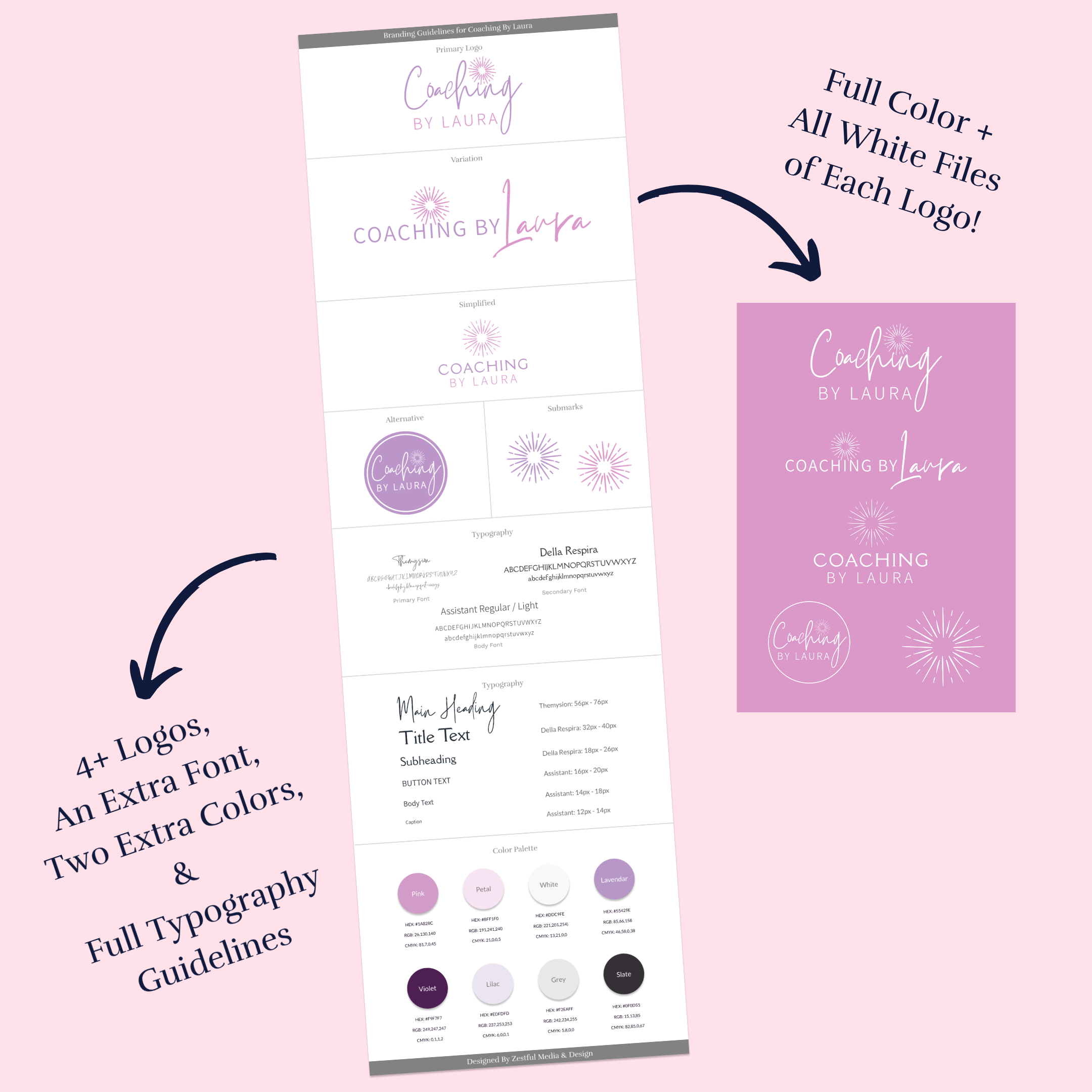Your entire brand package with all of your full color & all white varation logos files, branding details, and bonuses are delivered to you!