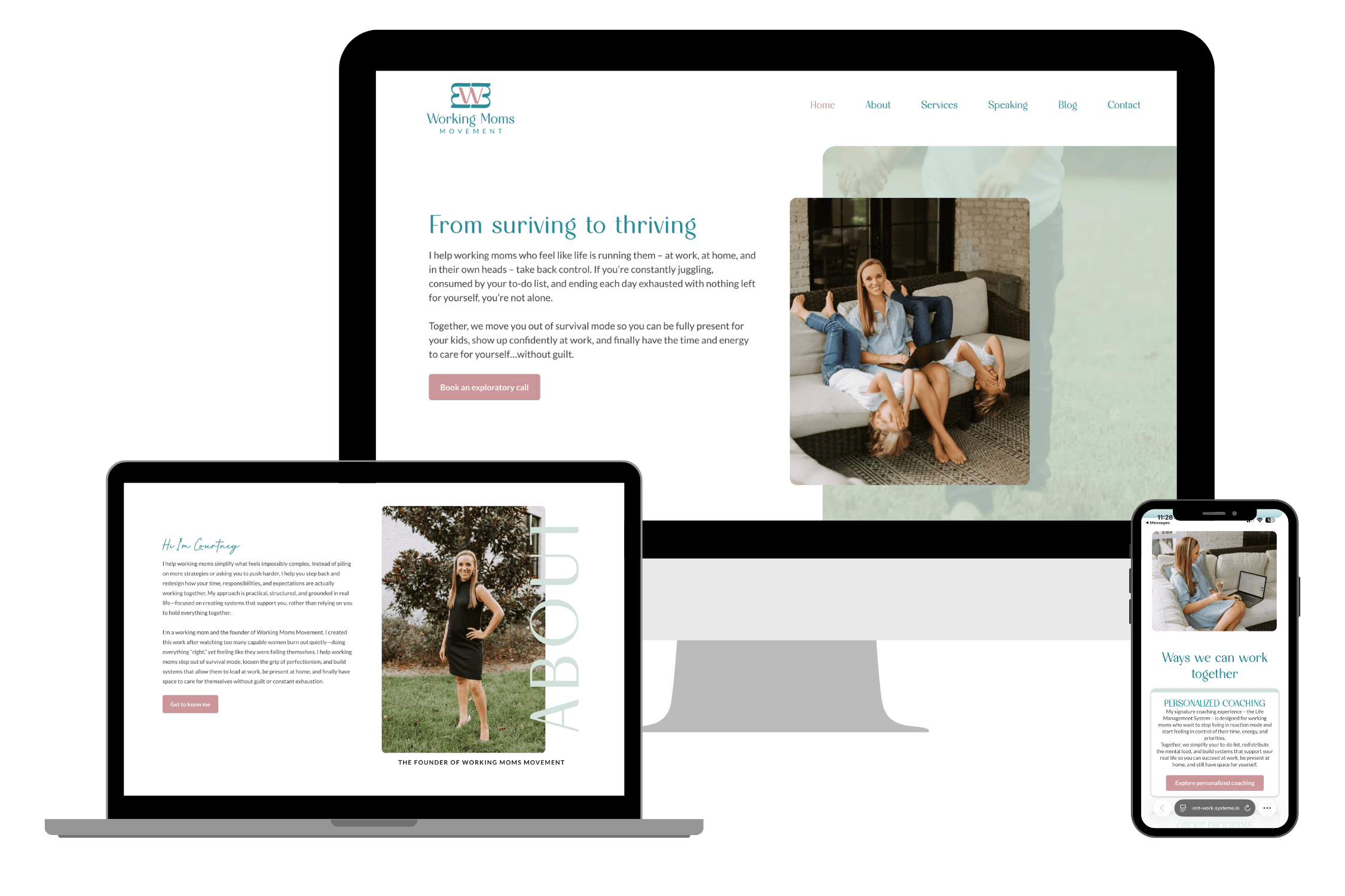 Working Moms Movement, founded by Courtney Cecil, came to us ready for her brand and website to finally reflect the level of professionalism and leadership she brings to her work. Courtney partners with corporations to strengthen support systems for female employees while also helping working moms become more productive with their time and energy — without sacrificing presence at home. She wanted a brand that felt warm and compassionate, yet polished and credible enough to resonate in corporate spaces. We built upon her existing color palette, refined it for stronger visual cohesion, selected professional, elevated fonts, and created a standalone lettermark emblem that could confidently represent the brand across platforms. The result was a thoughtful, balanced identity that feels both nurturing and authoritative..