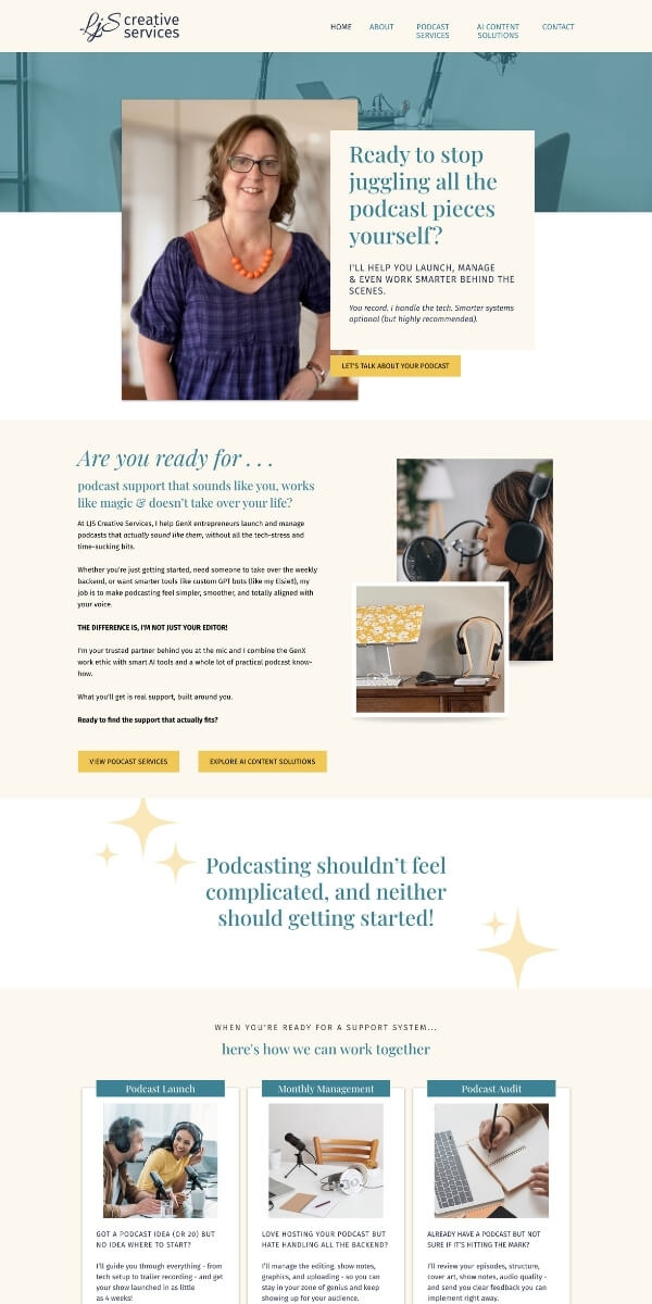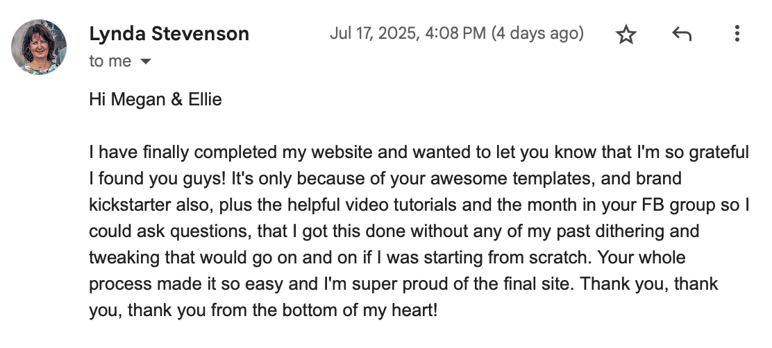 “I’d been overthinking the design and wording of my website for ages, but their step-by-step process showed me how to get things done quickly without sacrificing quality. The use of ChatGPT for my sales copy saved me so much time, and the focus on my brand colors gave me a fresh perspective on how to create cohesive, professional-looking pages. I’m so excited to launch my offers now with a polished, stress-free process!”